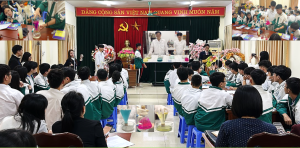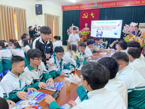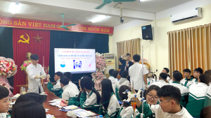 Ảnh 1 – Đại diện Chi hội Hóa học, giảng viên Trường ĐHSP – ĐH Thái Nguyên giao lưu với thầy và trò Trường THPT Dương Tự Minh, mở đầu chương trình trải nghiệm STEM.